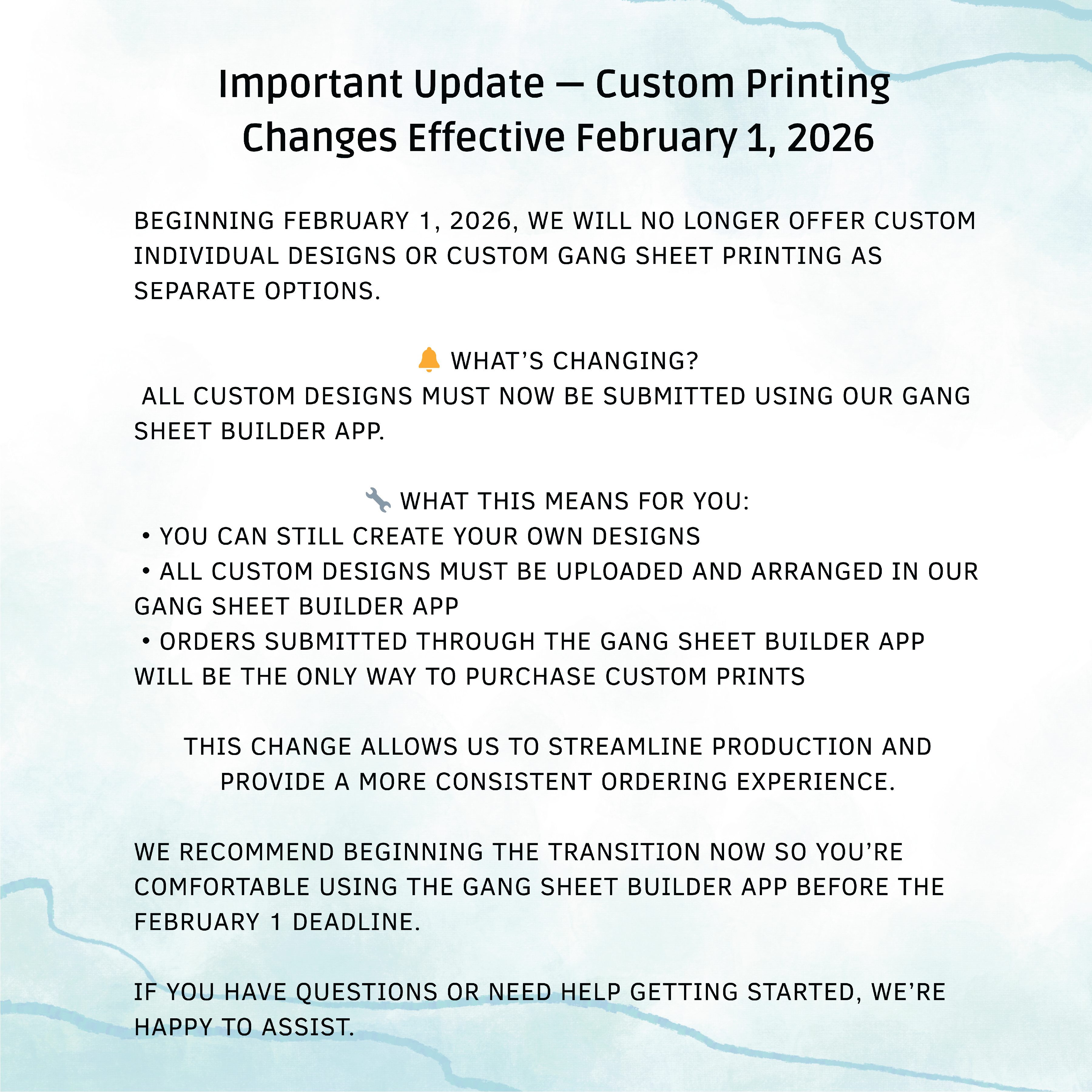 Please read Important Update on Custom Printing Below