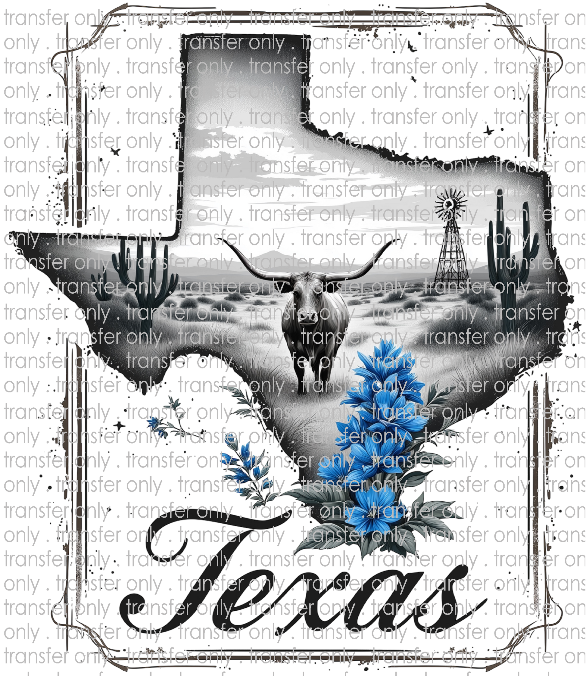 TX 173 Texas Black and White Scene with Blue Bonnets